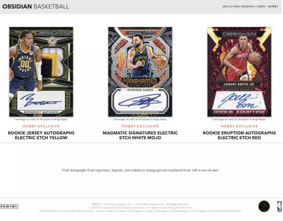 Collectors can expect to find 2 Autographs per 2022/23 Panini Obsidian Basketball Hobby Box. Search for Rookie Autographs in sets such as Rookie Jersey Autographs, Rookie Jersey Ink and Rookie Eruption Autographs. Also, find Autographs of superstar and retired players in sets such as Magmatic Signatures, Galaxy Ink and more!