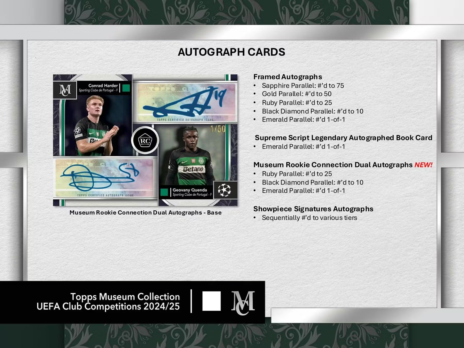 New for 2024/25: look for Museum Rookie Connection Dual Autograph Relic Cards, Home/Away Dual Relic Autograph Cards, and the instant classic Autographed UEFA Respect/Foundation Patch Book Cards.