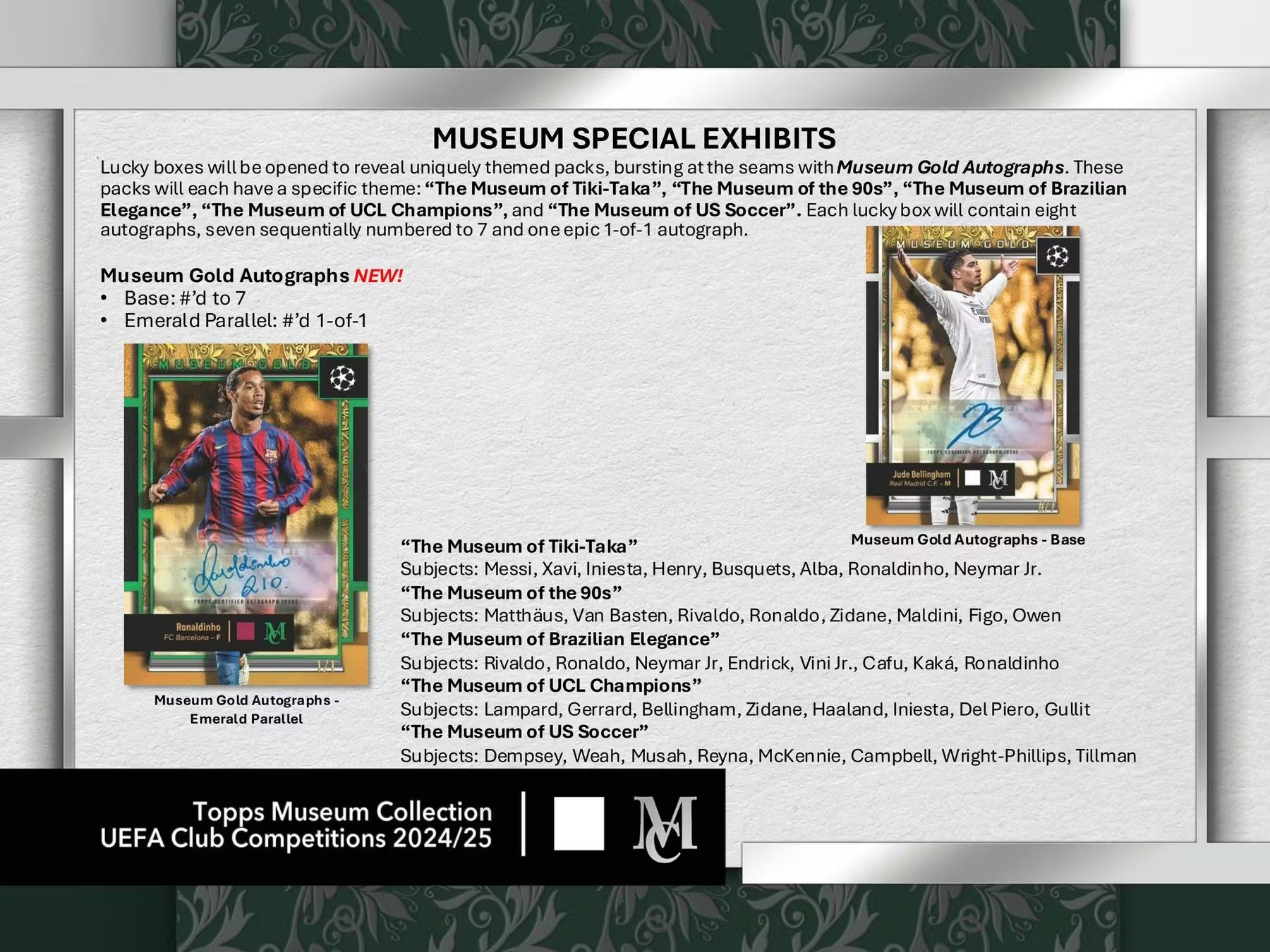 Lucky boxes will be opened to reveal uniquely themed packs, bursting at the seams with Museum Gold Autographs. These packs will each have a specific theme: "The Museum of Tiki-Taka", "The Museum of the 90s", "The Museum of Brazilian Elegance", "The Museum of UCL Champions", and "The Museum of US Soccer". Each lucky box will contain eight autographs, seven sequentially numbered to 7 and one epic 1-of-1 autograph.
