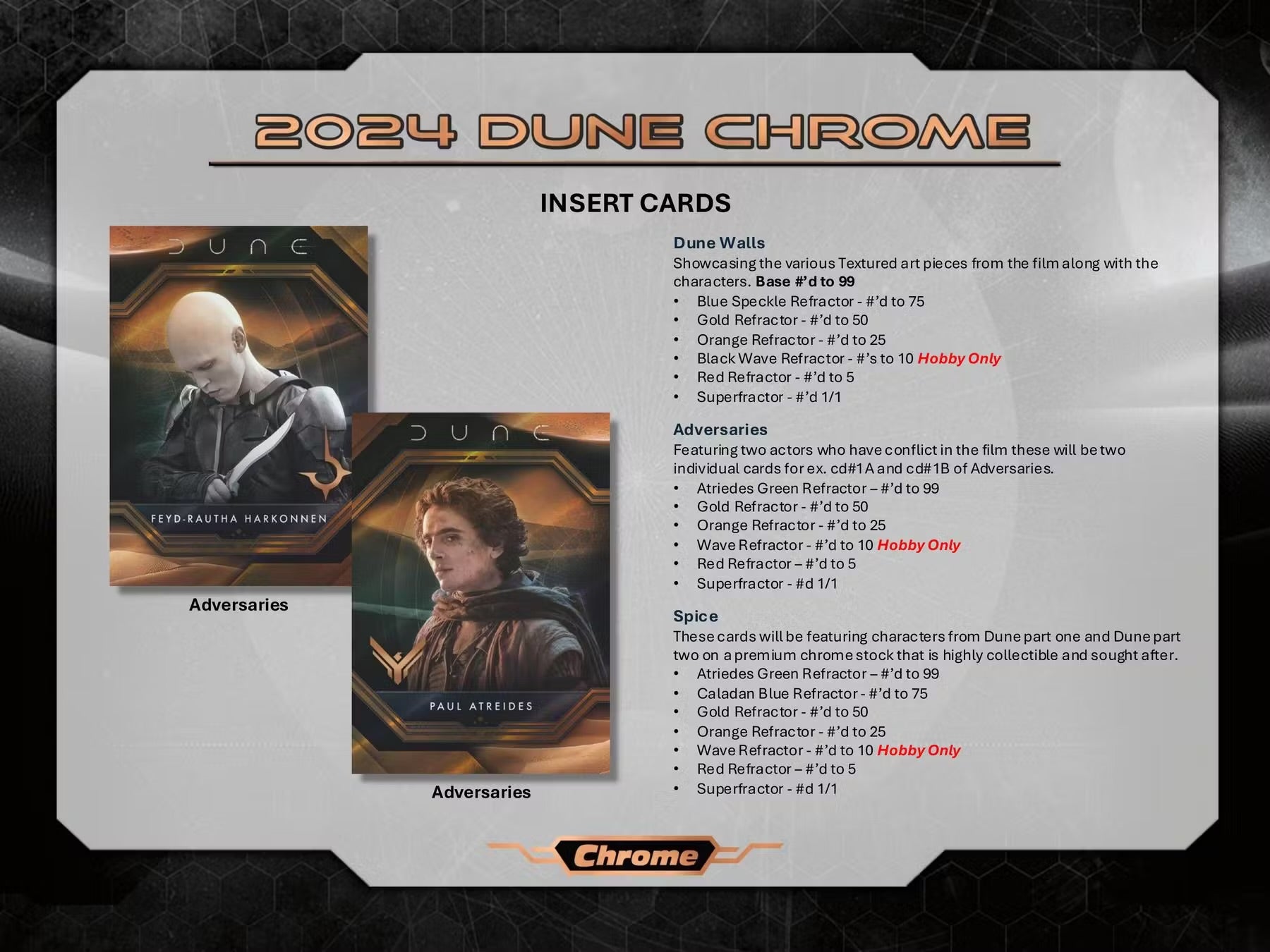 2024 Dune Chrome marks the first-ever Chrome trading card product for the 6x Oscar Winning Film filled with elite talent autographs and a variety of collectible card technology. Starting with an amazing packaging, this product includes one autograph or sketch every other hobby box and the ultimate chase hits SPICE cards with actual spice used in the film. We are offering many unique inserts like Spice, Dune Acrylics, and Art of Dune inserts along with many more.