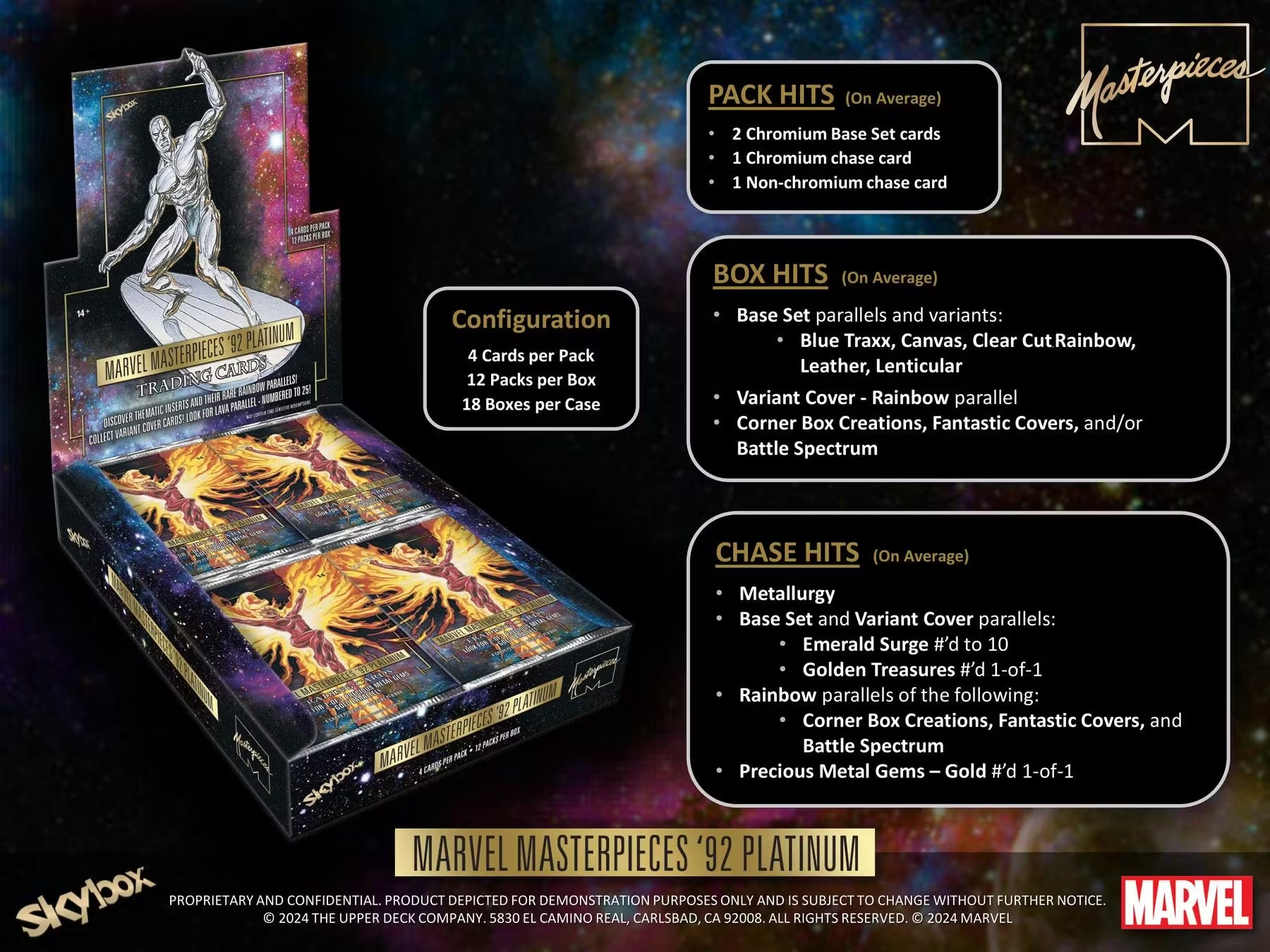 Marvel Masterpieces '92 Platinum is the platinum edition of the original 1992 Marvel Masterpieces! In this set, you will rediscover the original artwork via an enhanced variety of inserts and parallels such as Battle Spectrum, Precious Metal Gems, and Variant Covers...all highlighting Marvel characters in the brightest way!