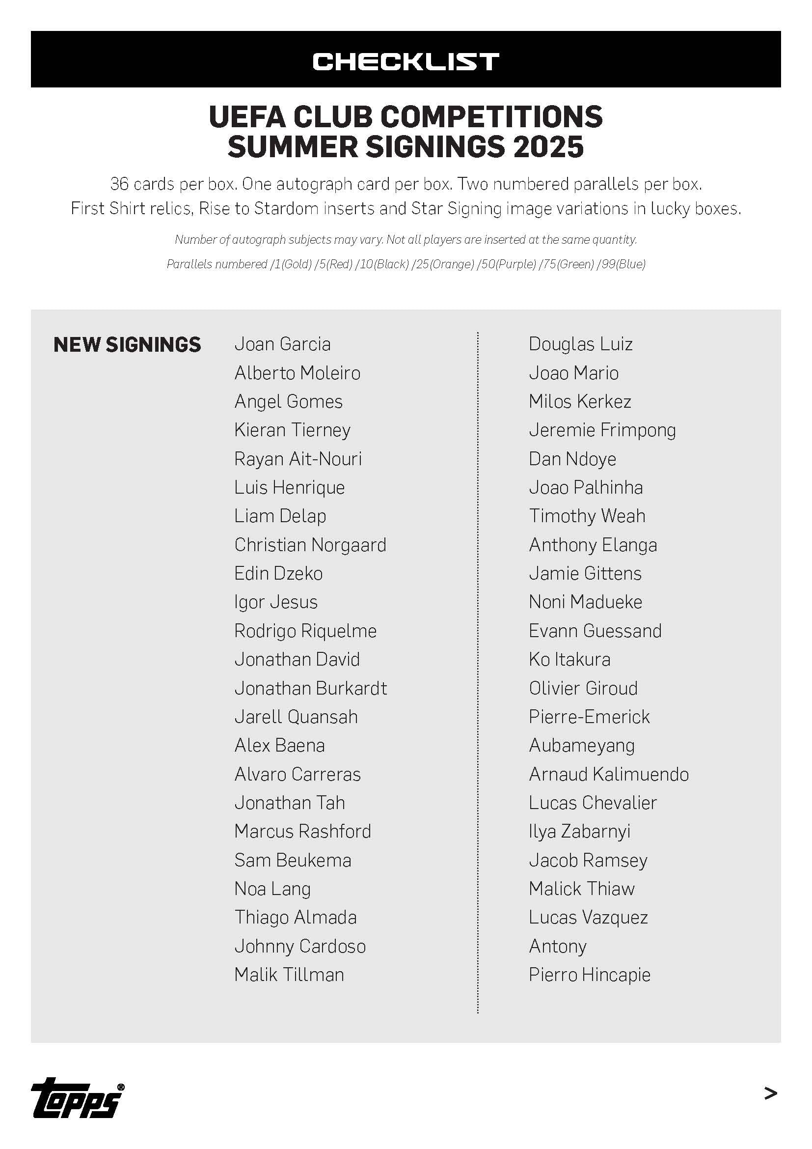 With 36 cards per box including an autograph and two numbered parallels, UCC Summer Signings is the perfect way to kick off the 2025/26 season.