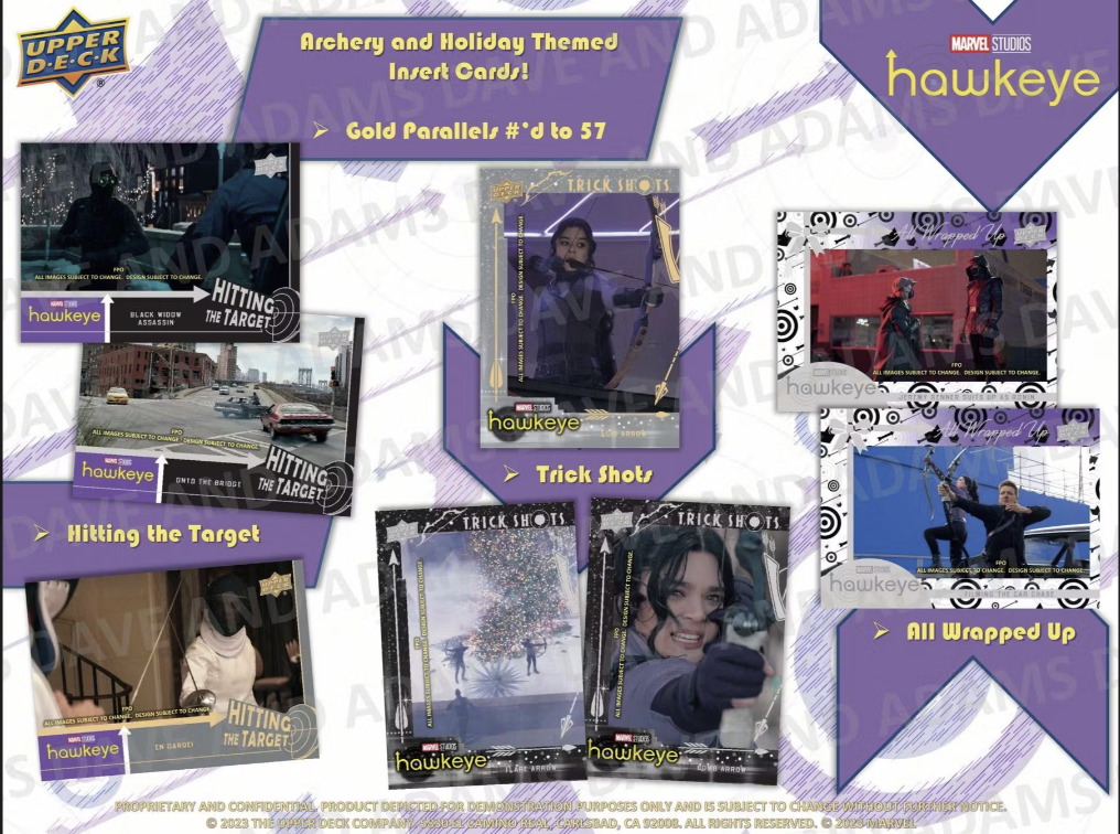 Take aim and hit your target with this excting and festive Marvel Studios Hawkeye entertainment trading card set. Celebrate the holidays with Kate Bishop and Clint Barton as they run around New York City on the search for who or whom is the true villian pulling all the strings. Collect colorful and impressively foiled cards with Adornments inserts. Look out for autographed parallels and other low numbered chase cards!